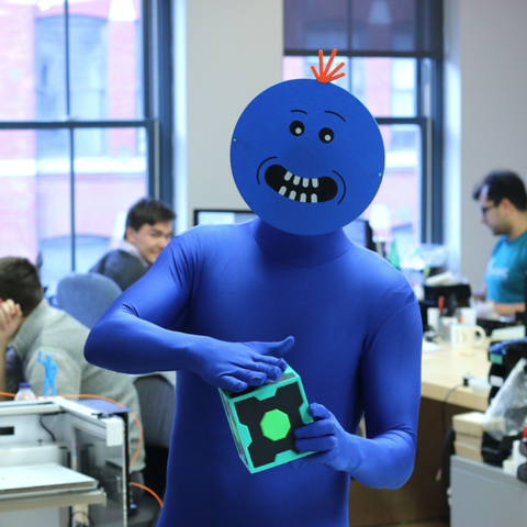 這里是我們的多色先生Meeseeks服裝套裝,包括一個先生Meeseeks面具,一個Meeseeks盒子和一個Plumbus,正好趕上萬圣節!