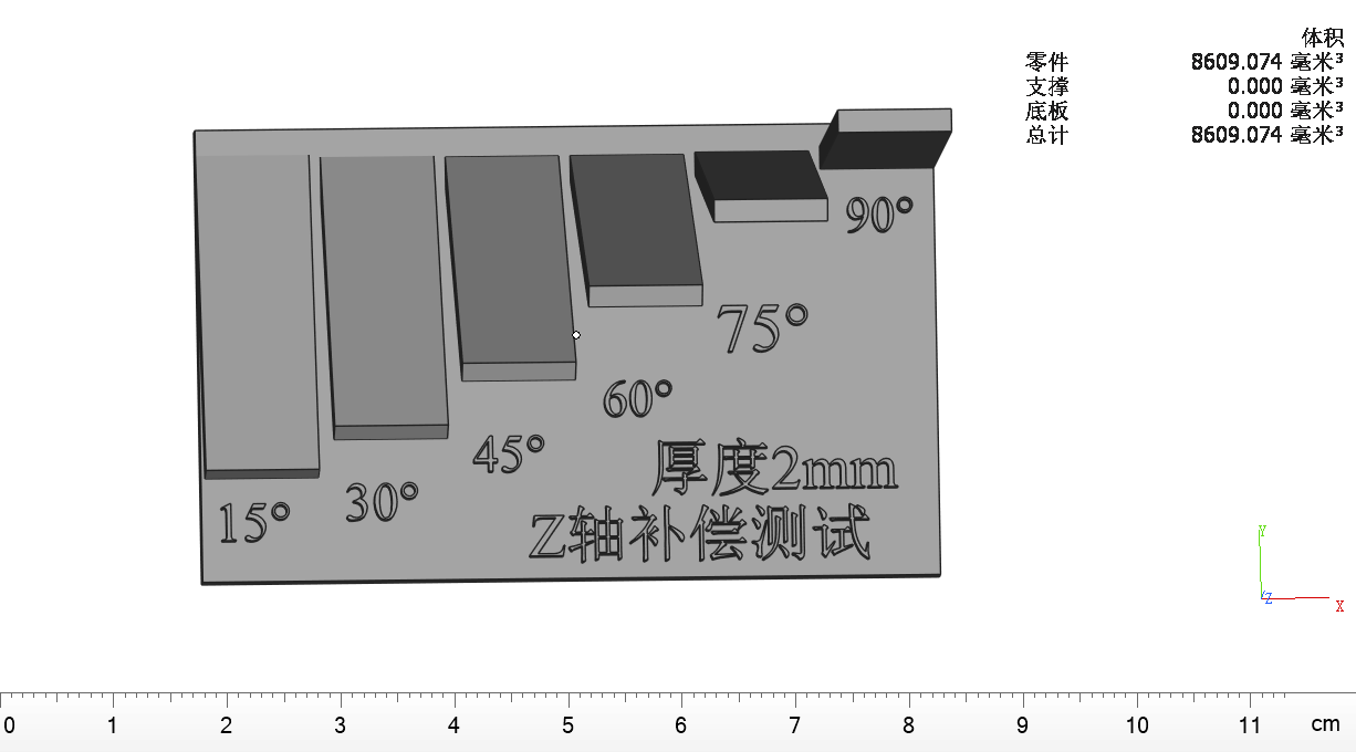 1.測試前提:在XY平面尺寸基本準(zhǔn)確,光斑補(bǔ)償值設(shè)置正確2.打印此模型,測試不同角度的厚度,計算出不同角度的偏差值,偏差值=實(shí)測值-理論值(2mm);3.計算不同角度的校正系數(shù),某角度的校正系數(shù)=(此角度的厚度偏差值)/(0°平面的厚度值);