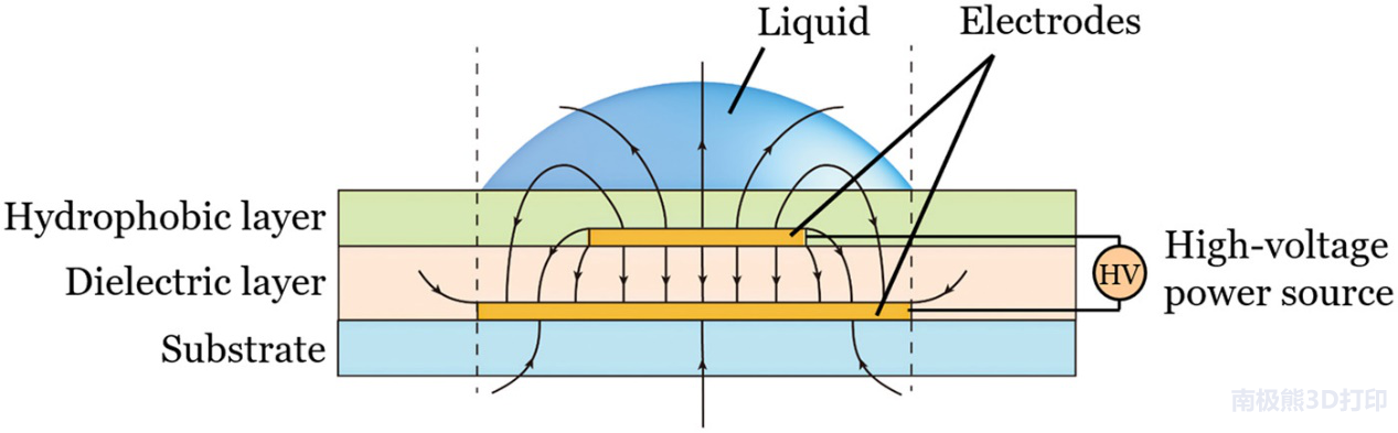 西安交通大學王鐵軍團隊提出了一種利用電容器邊緣效應對分辨率為100μm的水凝膠液圖案化的新方法(patterning liquids with the capacitor edge effect, PLEEC),結合圖案和堆疊工藝建立了完整的水凝膠3D打印系統。圖1是該技術的原理示意圖,利用電容邊緣效應時,可以產生具有許多不同性質的水凝膠,通過各種機制對材料進行交聯固化,克服了現有技術的局限性。
